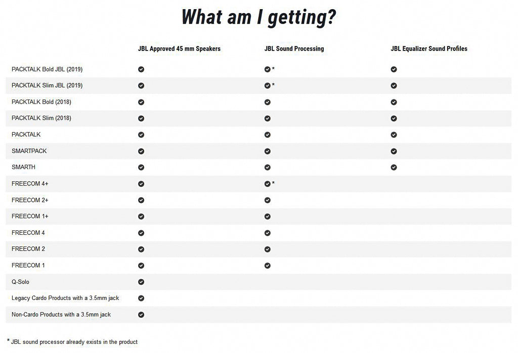 - Enhanced audio processing for Cardo FREECOM and PACKTALK series with JBL sound processor