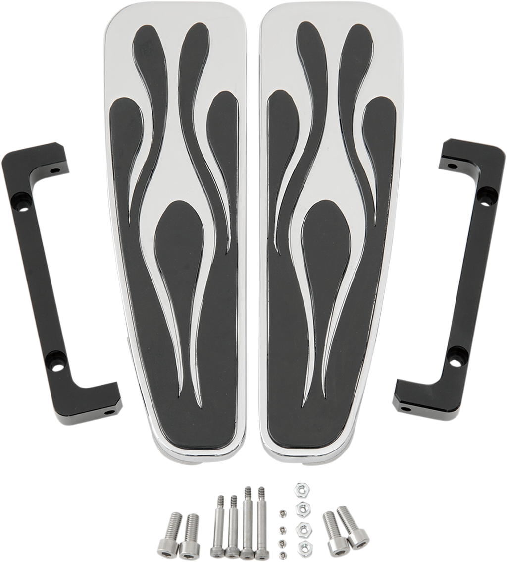 Provide better rider comfort by improving foot and leg positioning, Five quick adjustment positions to suit your needs, Increased leg room improves leg and knee comfort, Expanded foot positioning is provided by 13" length, tapering from 4" wide down to 2-3/8", Narrowed design allows for greater lean angles without the risk of touching down, Polished and chromed billet aluminum construction, Include stylized vibration-reducing rubber inlays and replaceable rub strips and rubber pads, Easy to install, Made in the U.S.A.