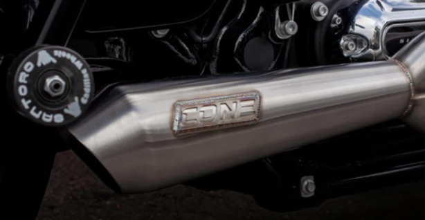 The Sweeper muffler uses our standard angled cone paired up with our slash cut end cap giving it an 11 degree exit angle to help redirect the exhaust towards the ground. Its our most "tamed" exhaust at idle and cruising using the most perforated core, but it still barks when you open it up.