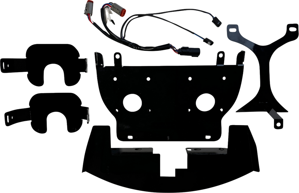 Gloss black vented speed plates accompany the lighting components, filling the voids on either side of the lights and blending the aggressive Shark Demon® aesthetic with a sleek, modern appearance. The vented design allows factory airflow, helping to keep components cool during operation. Stainless steel mounting brackets and all necessary hardware are included, ensuring a secure fit and hassle-free setup. The kit is compatible with optional factory-style Shark Demon® LED turn signals or integrated front turn signal vents, which are sold separately, allowing customization based on your preferences and local regulations. Please check your local and state laws regarding front turn signals before installation to ensure compliance. With its durable construction and high-performance lighting, this kit is ideal for riders seeking a bold look and enhanced visibility on the road.