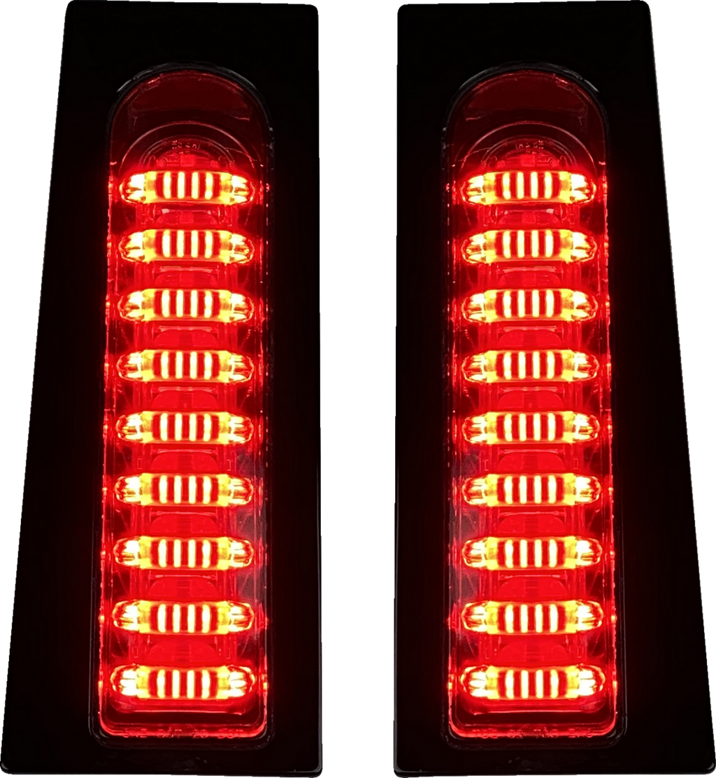 The CUSTOM DYNAMICS ProBEAM® Fillerz® Dual Color Lights are designed to seamlessly fill the stock oval cutout on touring model fender supports, providing a sleek and integrated look. These lights feature a durable smoke lens with a glossy black finish that complements a variety of motorcycle styles. Equipped with 9 running light pipes and a bright amber turn signal, they enhance visibility and safety during both day and night riding. The plug-and-play adapter simplifies installation, making it easy to upgrade your motorcycle's lighting system without complex wiring.