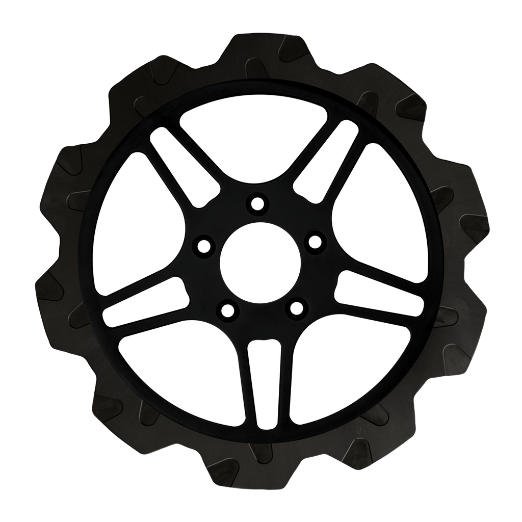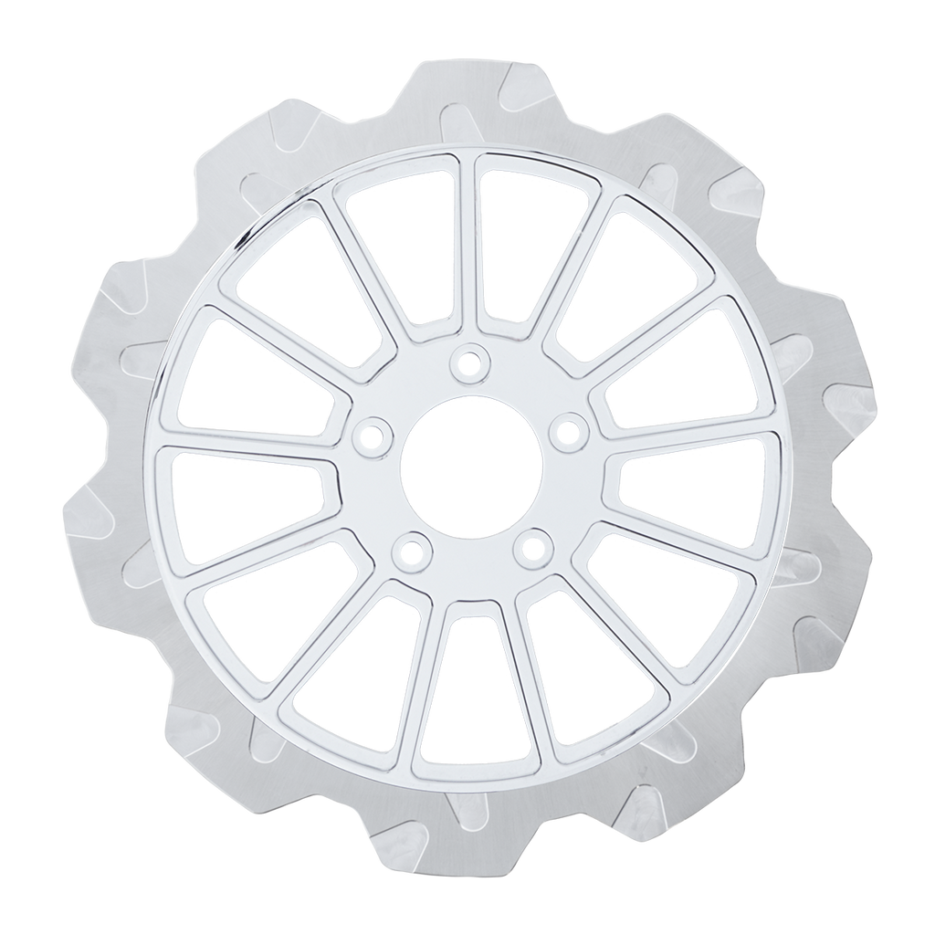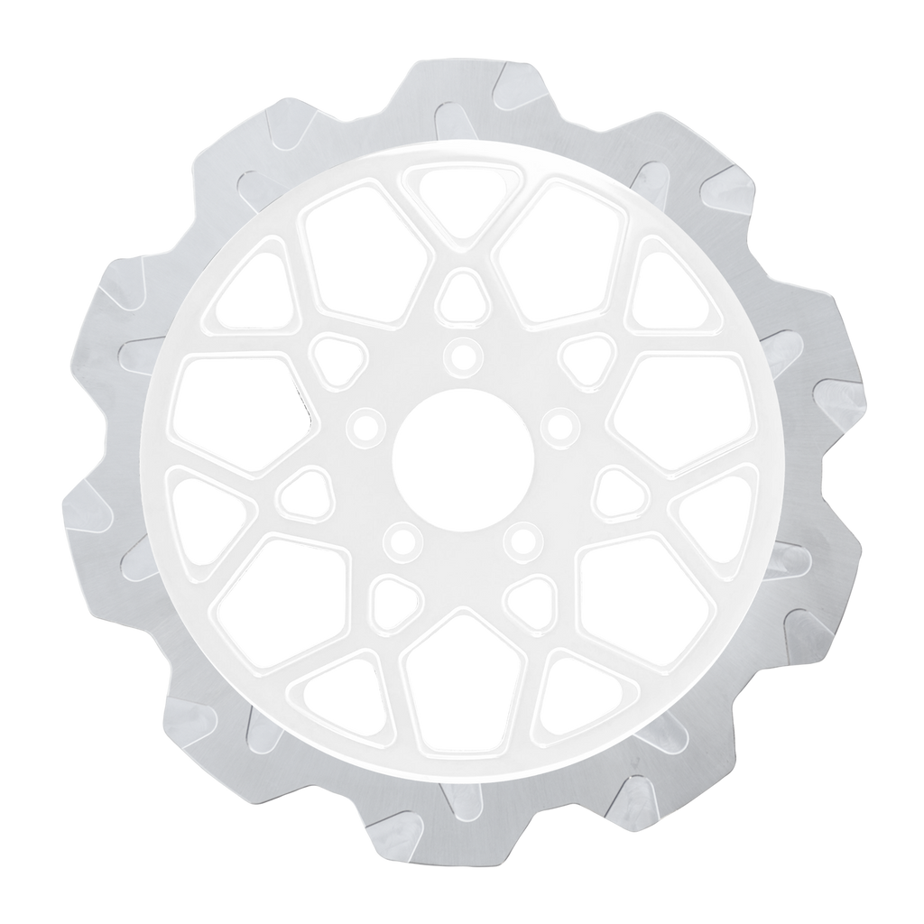 The reduced weight of Lyndall Crown cut rotors enhances rider control by minimizing rotating mass, while the incorporated gas slots effectively outgas debris and gasses generated during friction, preserving the rotor's integrity against brake pad wear and aiding in cooling.