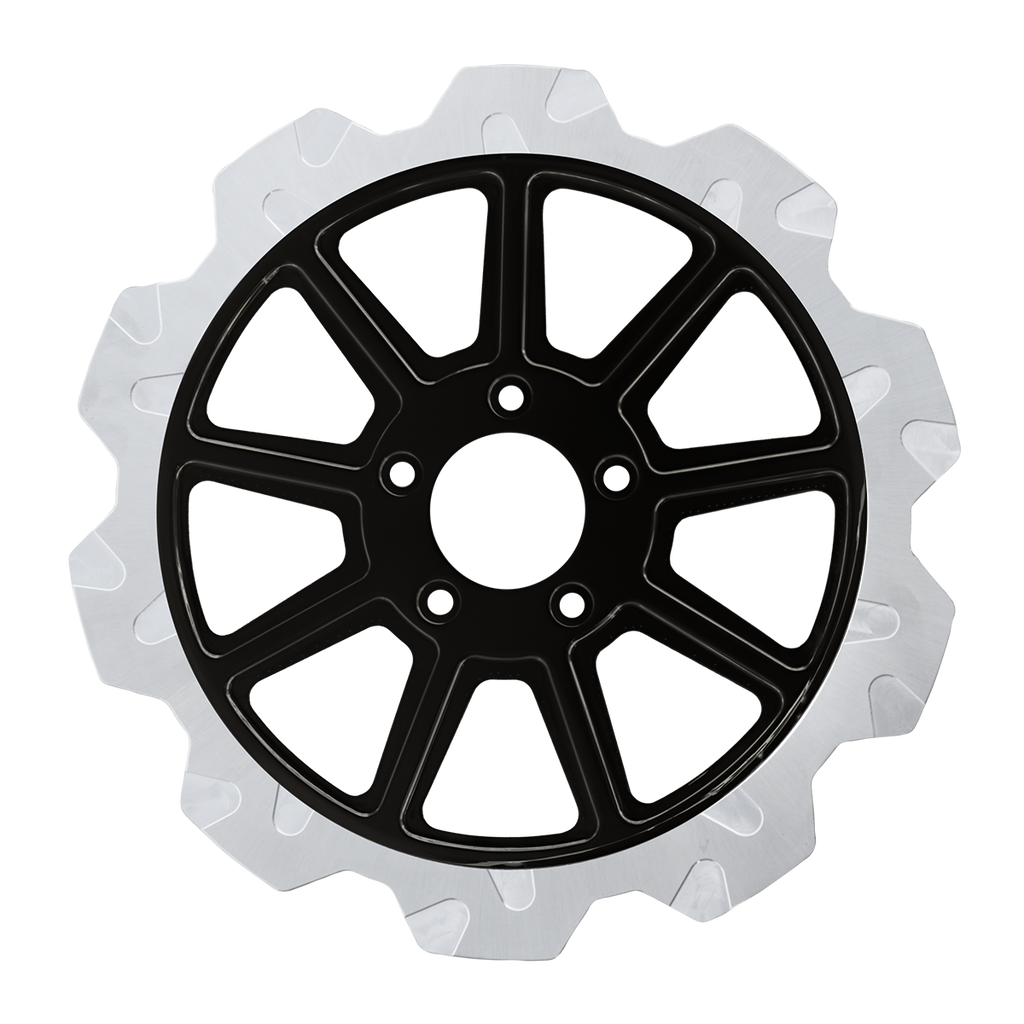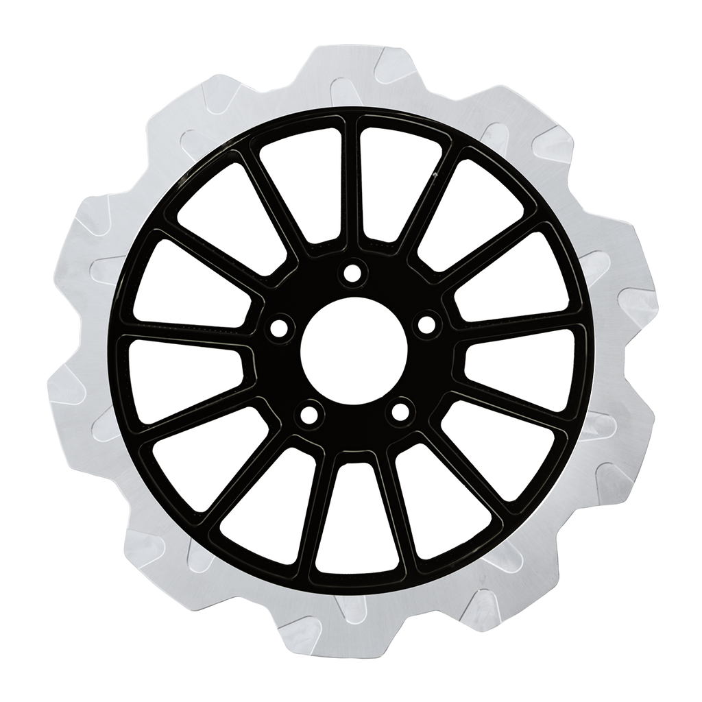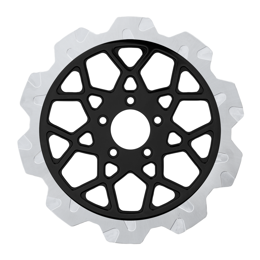 The reduced weight of Lyndall Crown cut rotors enhances rider control by minimizing rotating mass, while the incorporated gas slots effectively outgas debris and gasses generated during friction, preserving the rotor's integrity against brake pad wear and aiding in cooling.