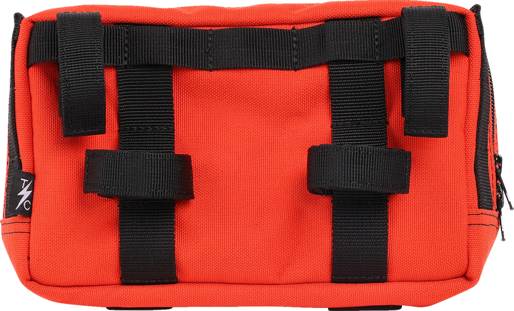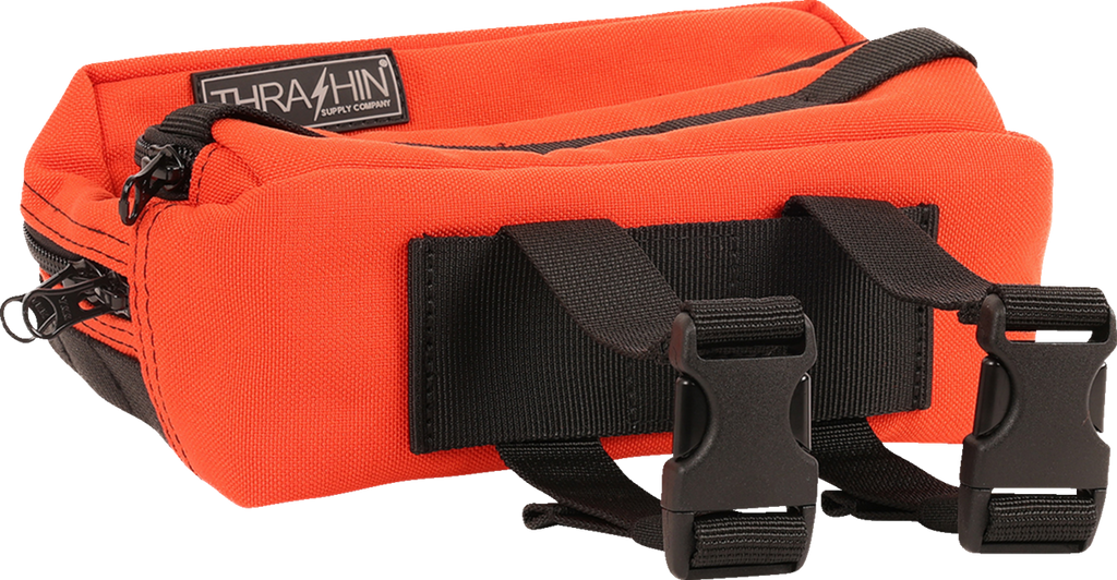 The Thrashin Supply Co. Handlebar Bag Plus offers increased storage capacity and enhanced organization for your cycling adventures. Constructed from durable 1050D nylon fabric, this bag is built to withstand the rigors of outdoor use while providing a sleek, functional design. Its high-visibility orange interior makes it easy to locate contents quickly, even in low-light conditions. The bag measures approximately 9 inches long, 5 inches wide, and 4 inches high, providing ample space for essentials without adding unnecessary bulk. Equipped with YKK zippers, the Handlebar Bag Plus ensures secure closure and reliable performance during rides.