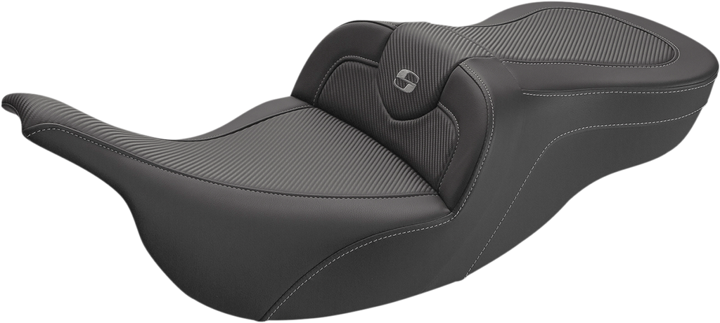 The SADDLEMEN Roadsofa™ Seat combines advanced materials and ergonomic design to enhance rider comfort on Harley-Davidson FL models from 1999 to 2007. Featuring a tall lumbar support and wide driver saddle, this seat provides superior back and leg support, reducing fatigue during long rides. The streamlined nose design improves reachability to the ground, making mounting and dismounting easier and safer for riders of all sizes. Constructed from contrasting carbon-fiber weave and SaddleHyde™ material, the seat offers durability and a sleek appearance that complements the motorcycle's aesthetic.