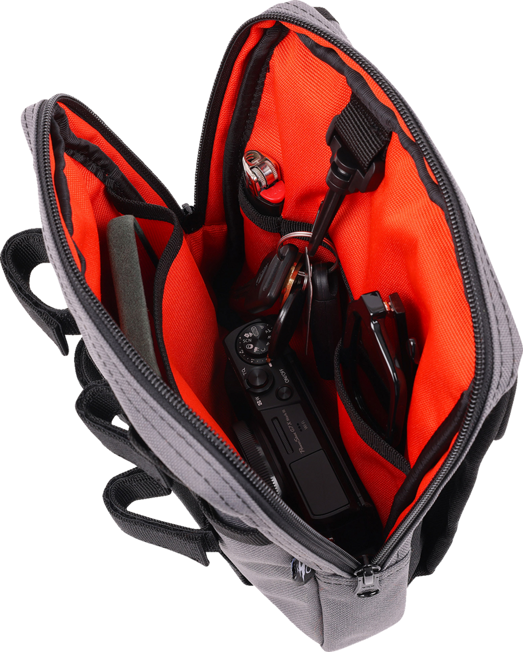 The Handlebar Bag Slim offers slim storage with the ability to expand to fit a variety of items, Versatile design allows it to mount on the front or rear of risers while providing a slim profile to fit in between fairings and gas tanks, 1050D nylon fabric, High vis orange interior , Dimensions: 9" x 8"x 2", Front hook-and-loop pocket expands and is lined with microfiber material, great for sunglasses or electronics, MOLLE webbing on front pocket, Vertical and horizontal attachment points mount to risers and/or bars in multiple configurations for different size risers using hook-and-loop straps, YKK zipper
