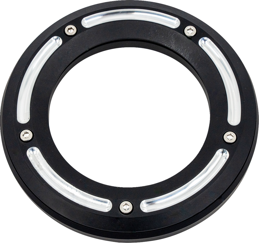 The TRASK Assault Derby Cover with Window (Part Number TM-0040RC) is designed to enhance the appearance and functionality of your Big Twin motorcycle. Crafted from billet machined 6061-T6 aluminum, this derby cover offers durability and a premium finish that withstands the rigors of riding. The cover features a unique LEXAN window design that provides a clear view of your clutch system, allowing you to monitor its condition without removing the cover. This innovative feature combines functionality with style, making it an excellent upgrade for motorcycle enthusiasts.