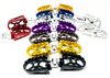 DEATH METAL RACING BEAR TRAP PEGS. BMX STYLING WITH THAT AGGRESSIVE NO SLIP GRIP. MACHINED FROM 6061 T-6 BILLET ALUMINUM WITH BILLET 7075 360 DEGREE ADJUSTABLE CLEVIS WITH LOCKING SET SCREW AND SET SCREW IN THE END OF CLEVIS TO ADJUST THE ANGLE OF THE PEG (STANDARD HARLEY MALE MOUNT CLEVIS ONLY). LASER ENGRAVED LOGO. CAN BE USED FOR DRIVER OR PASSENGER PEGS. Standard clevis fits all Harleys with standard style clevis footpeg mounts. ALSO AVAILABLE FOR 2018-UP MILWAUKEE 8 (M8) SOFTAIL, ELW, and Pan America ( M8 SOFTAIL CLEVIS' WILL ACCEPT THE STOCK SPRING UP FRONT AND BALL DETENT ON THE REAR.) MOST ALL OTHER MODEL HARLEYS USE THE STANDARD HARLEY MALE MOUNT CLEVIS WITH 3/8" MOUNTING HOLE, (EXCEPT 13-17 FXSB/SE, 11-13 FXS, 08-11 FXCW/C, 13-17 XL1200V, XL1200X, XL1200C, XL1200CX). CAN BE USED FOR DRIVER OR PASSENGER PEGS ON BAGGER MODELS WITH FOOTPEG MOUNTS, NOT FLOORBOARD MOUNTS. BAGGER PASSENGER PEG MOUNTS USE THE STANDARD STYLE CLEVIS. HARLEY BRACKETS THAT REPLACE THE FLOORBOARD MOUNTS ON THE FRONT OF LATE MODEL BAGGER MODELS USE M8 SOFTAIL FRONT CLEVIS'. MOST AFTERMARKET FORWARD CONTROLS FOR BAGGERS USE STANDARD MALE CLEVIS'. IF YOU ARE UNSURE, PLEASE CONTACT US BEFORE ORDERING. THE PEG ITSELF NOT INCLUDING CLEVIS MEASURES 3-1/2" BY 2-1/4". AVAILABLE IN RAW/MACHINE FINISH, CHROME, BLACK ANODIZED, RED ANODIZED, BLUE ANODIZED, GOLD ANODIZED, AND HARLEY BRONZE POWDERCOAT. Powdercoated parts are done per order and usually take 1 to 1-1/2 weeks turnaround. CHROME FINISH WILL NOT HAVE THE LASERED LOGO ON THEM, it will be machined into part. PROUDLY MADE IN THE U.S.A.
