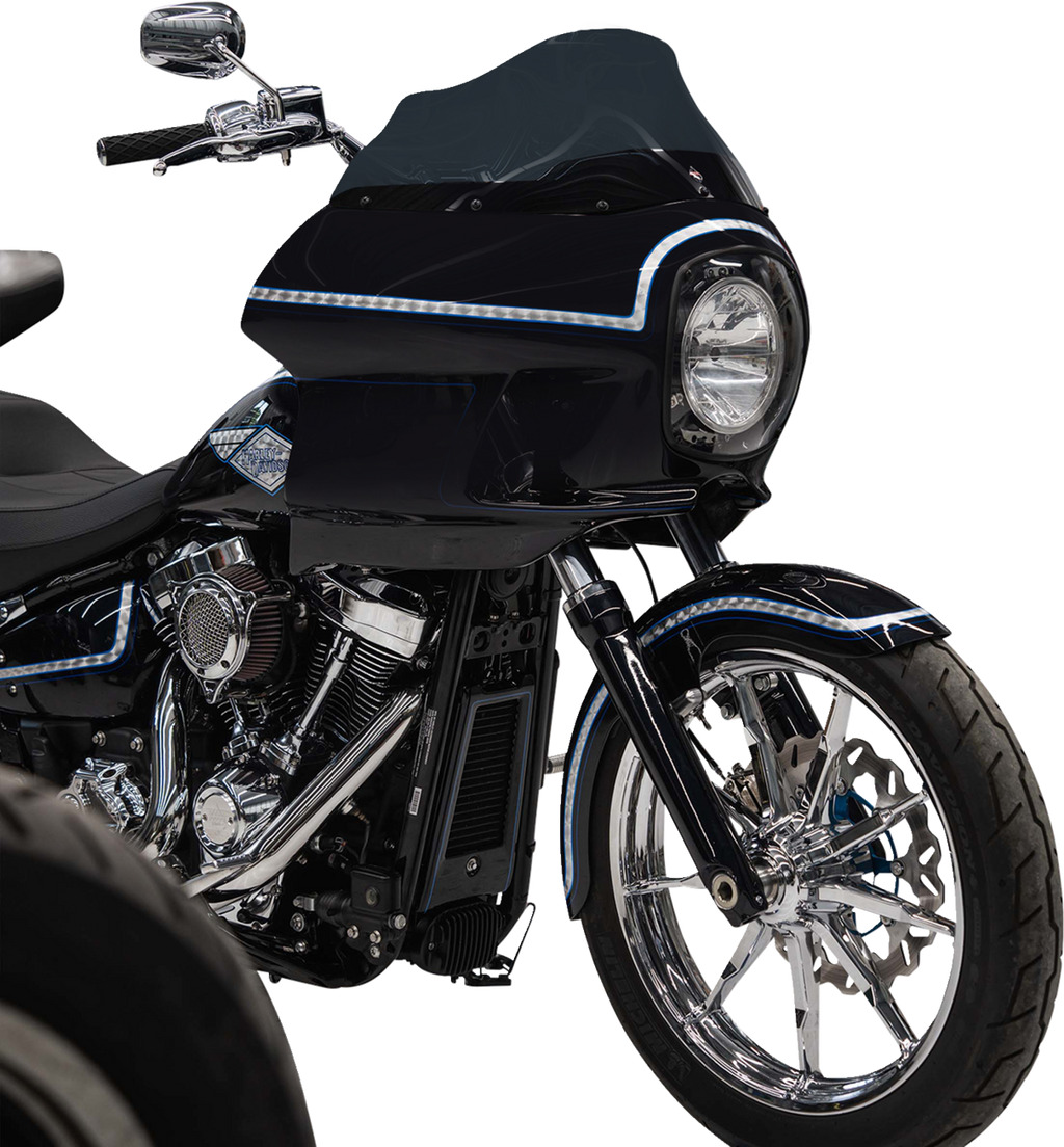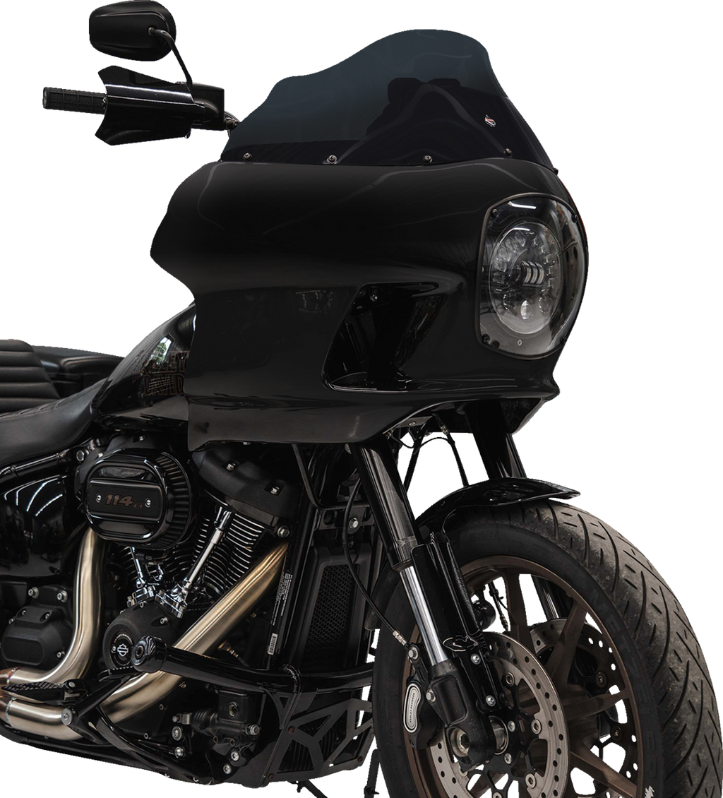Classic reproduction FXRP-style fairing designed to elevate your motorcycle's style and performance, Brings together the perfect blend of air management, design, and craftsmanship, Comes as a complete kit, ensuring that you have everything you need for a seamless installation, Polyester Primed Fiberglass Fairing * after test fit, it's ready to hand to your painter, Powder-coated neck bracket, 7* headlight mount * headlight not included, Clear headlight cover with gasket, 9* dark smoke Flare* windshield (part # 2310-0635), All necessary fasteners and hardware, Proudly made in the U.S.A.