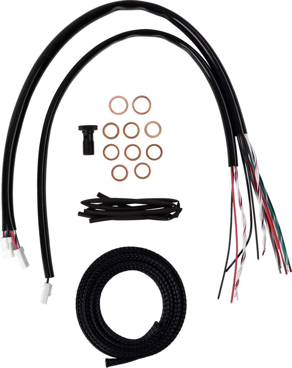 Kit includes the correct length braided brake/clutch lines and wire extensions to complete a handlebar swap, Black "T" brake line junction, banjo bolts, fittings and copper crush washers included, Made in the U.S.A., Kit is based on using 2" risers with Ape Hanger handlebars.
