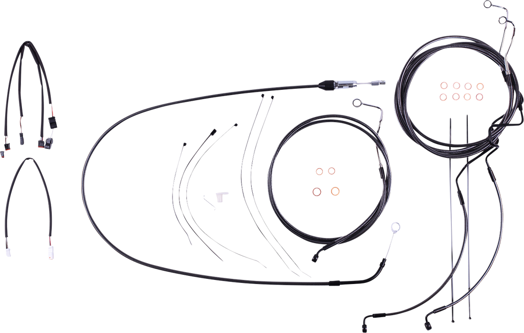 The only complete kit with matching braided cables and brake lines, Kit includes throttle and idle cables of throttle-by-wire extensions, clutch cable or hydraulic clutch line, brake lines, copper crush washers, hardware, and any necessary switch wiring of turn signal extension, All cables are a low-effort, high-efficiency design that meets or exceeds all OE specifications for fitment, construction, endurance, Kit for dual disc models includes an all brazed manifold that eliminates leaks, alignment problems and unattractive threaded connections, Assembled in the U.S.A., Kit is based on using ape hanger style handlebars with 2* risers.