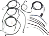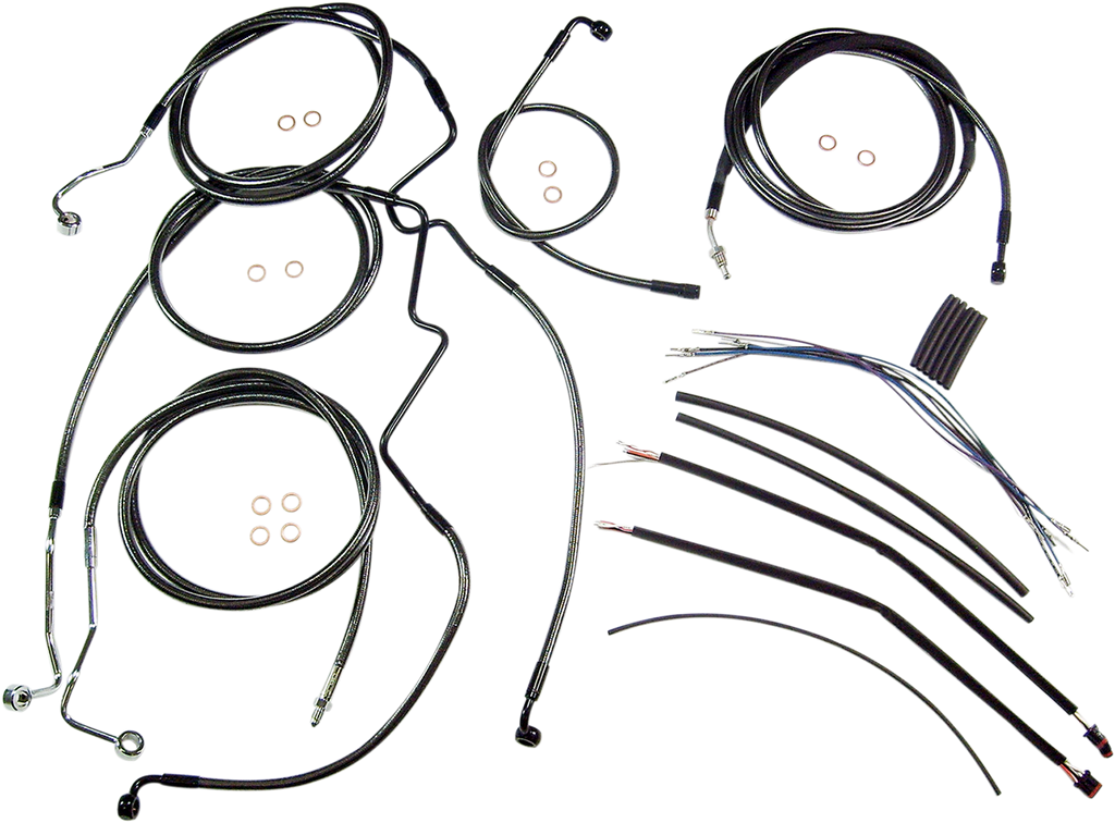 The only complete kit with matching braided cables and brake lines, Kit includes throttle and idle cables of throttle-by-wire extensions, clutch cable or hydraulic clutch line, brake lines, copper crush washers, hardware, and any necessary switch wiring of turn signal extension, All cables are a low-effort, high-efficiency design that meets or exceeds all OE specifications for fitment, construction, endurance, Kit for dual disc models includes an all brazed manifold that eliminates leaks, alignment problems and unattractive threaded connections, Assembled in the U.S.A., Kit is based on using ape hanger style handlebars with 2* risers.