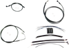 The only complete kit with matching braided cables and brake lines, Kit includes throttle and idle cables of throttle-by-wire extensions, clutch cable or hydraulic clutch line, brake lines, copper crush washers, hardware, and any necessary switch wiring of turn signal extension, unless otherwise noted, All cable and brake lines feature Black Pearl braid with highly polished black chrome plated fittings, All cables are a low-effort, high-efficiency design that meets or exceeds all OE specifications for fitment, construction, endurance, Kit for dual disc models includes an all brazed manifold that eliminates leaks, alignment problems and unattractive threaded connections, Assembled in the U.S.A., Kit is based on using ape hanger style handlebars with 2* risers.