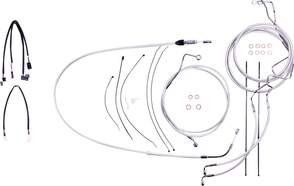 Complete kit comes with matching braided cables and brake lines, Kit includes throttle and idle cables of throttle-by-wire extensions, clutch cable or hydraulic clutch line, brake lines, copper crush washers, hardware, and any necessary switch wiring of turn signal extension, All cable and brake lines feature Sterling Chromite II braid with highly polished chrome plated fittings, All cables are a low-effort, high-efficiency design that meets or exceeds all OE specifications for fitment, construction and endurance, Kits for dual disc models includes an all brazed manifold that eliminates leaks, alignment problems and unattractive threaded connections, Assembled in the U.S.A., Kit is based on using ape hanger style handlebars with 2* risers.
