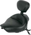 Solo seat is trimmed with a functional skirt that comes down over the frame and fender for a clean, uninterrupted look, Backrest has four height adjustments from 13.5" to 15.5" above seat bucket, and measures 7" high by 12" wide, Matching rear seat features a recess in the front of pad to accommodate the backrest (sold separately), Backrest is easily removed and installed without tools; folds forward for easy mounting of bike, Steel base with support wings holds up the full width of the foam bucket, Made in the U.S.A.