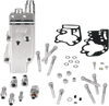 Kit includes oil pump, universal cover with top and bottom feeds, mounting bolts, supply and return gears, drive shaft with keys and snap rings, check ball and spring, pressure relief valve and spring, check ball and release valve cover screws with O-rings, miscellaneous hose fittings, plugs, screws and gaskets, Standard covers feature top and bottom feeds, universal covers have a number of oil feed and return options, allowing maximum flexibility for customized applications, Pump features a smoother design and pressure relief towers that are .300" shorter than the OEM oil pump, Accepts 3/8" rubber oil lines, Oil pump rebuild kit available separately, Made in the U.S.A., '73-80 models may require drilling; use drilling jig PART # DS-197009 (sold separately).