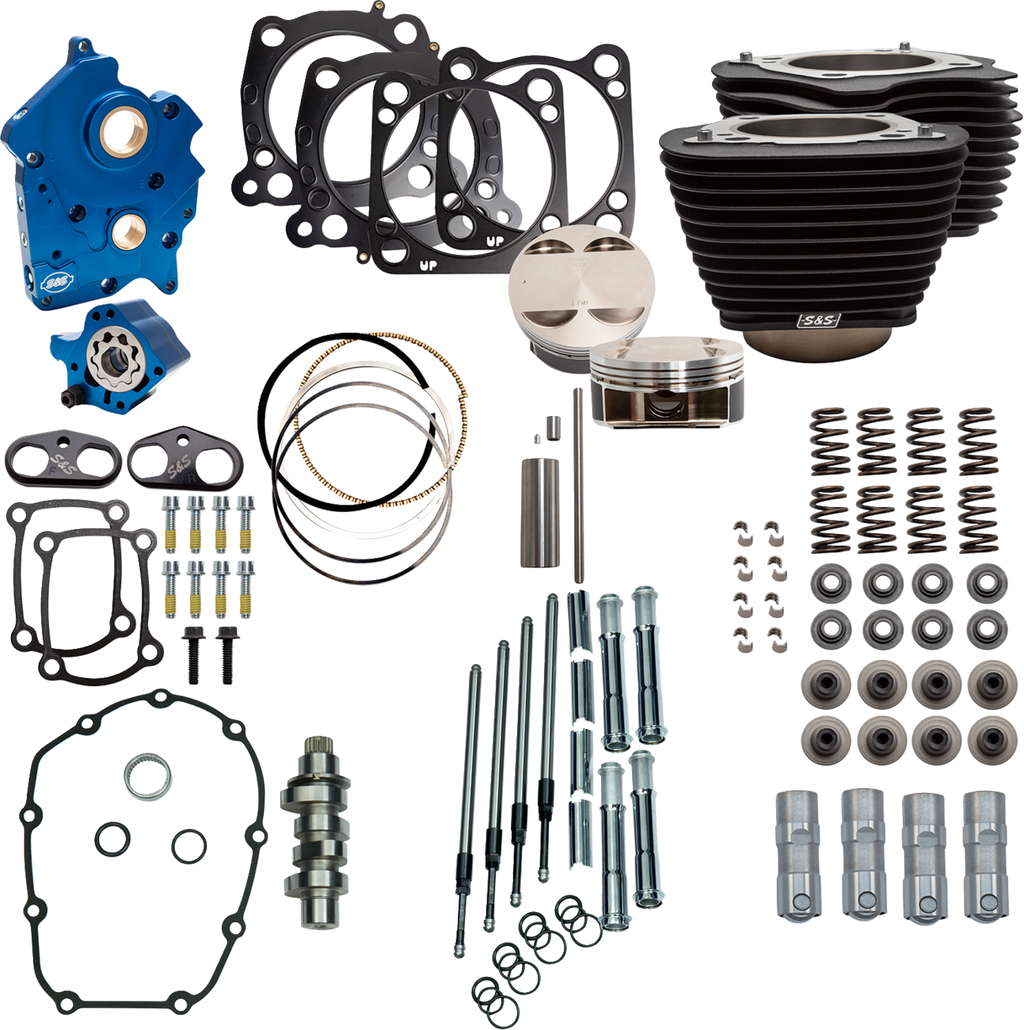 114" to 128" big bore kit; 114" and 117" CVO to 128" big bore kit, Bolt-in kit, case maching not required, Forged pistons, Includes oil pump/cam plate, pushrods with chrome covers, tappets, tappet cuffs, S&S 550 camshaft, and valve springs , Not for 121" CVO models.