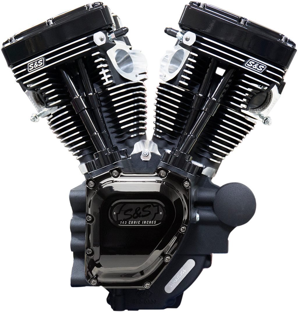 The S&S Cycle T143 Black Edition long block engine is engineered for high performance and reliability in Dyna chassis motorcycles. Crafted with CNC-machined B3 cylinder heads, this engine features two-bolt exhaust flanges for secure mounting and optimal exhaust flow. The engine is equipped with S&S 635 easy-start gear drive cams and 1.725:1 rocker arms, providing a total lift of .674 inches for impressive power delivery and smooth operation. Built on Super Stock™ T2 crankcases with reed breather valve three-piece flywheels, the T143 offers durable construction designed to withstand demanding riding conditions. Complemented by a high-flow oil pump and cam cover, this engine ensures excellent oil circulation and cooling, promoting longevity and consistent performance. The premium high-performance tappets further enhance valve operation, making this a comprehensive upgrade for serious enthusiasts. Manufactured in the USA, the T143 Black Edition is designed to fit seamlessly into stock chassis without the need for cutting or frame modifications, simplifying installation. It does not include carburetor, intake, or ignition system, which must be purchased separately. Notably, the revised oil routing on '99-'06 Touring models eliminates the need for an oil line installation kit, streamlining the upgrade process. Whether you seek increased horsepower or a reliable upgrade, the S&S Cycle T143 Black Edition long block engine offers a powerful, ready-to-install solution for your Dyna motorcycle.