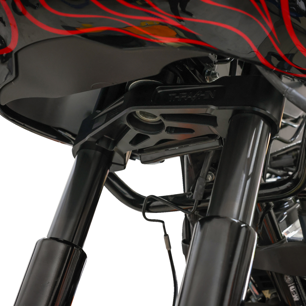 Comes with block off plate which allows for OEM steering lock delete, Remove the block off plate and use your OEM steering lock and key w/ no other pieces needed, Go above and beyond with our Carbon Fiber Lock Cover (Sold separately), Two riser mounting locations to tailor bike fitment (Stock location and 1.35* closer to rider), Comes with Billet Stem Cap and Bolt, Riser bushings not needed, Hardware included, Made in U.S.A, Stocks cables will work with total Riser and Bar height up to 15*., Does not work on CVO or CVO ST models.