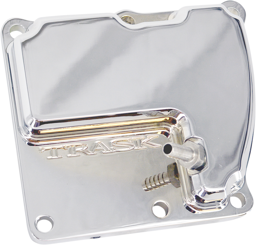 The package includes a vented hose and breather filter, ensuring a complete and ready-to-install solution. Whether you're looking to improve your bike's performance or enhance its appearance, the TRASK CheckM8™ Vented Transmission Top Cover offers a sleek chrome finish that matches various custom builds. It’s an ideal upgrade for riders seeking increased engine efficiency, reduced maintenance hassle, and a race-inspired look.